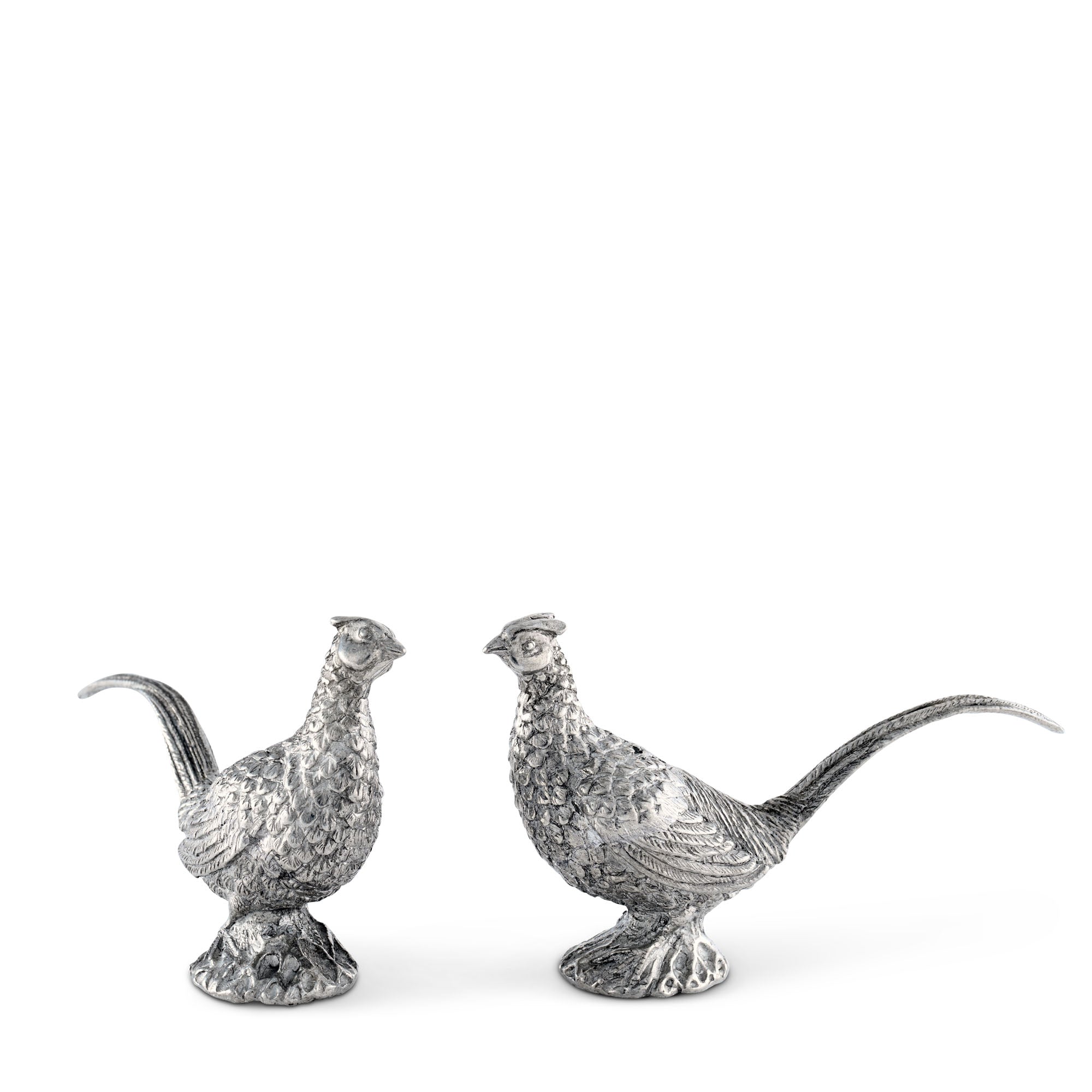 Introducing the Pewter Pheasants Salt and Pepper Set, an elegant addition to any dining table. Designed by master wildlife artist, Helen Richard, this salt and pepper set is a true work of art. The pair of pheasants are expertly crafted from high-quality pewter and feature intricate details, from the feathers to the beaks. Use these mini-statues to bring a touch of luxury and style to your dining experience. Whether for a special occasion or everyday use, these pewter pheasants are sure to impress your guests and add a touch of elegance to your table setting.