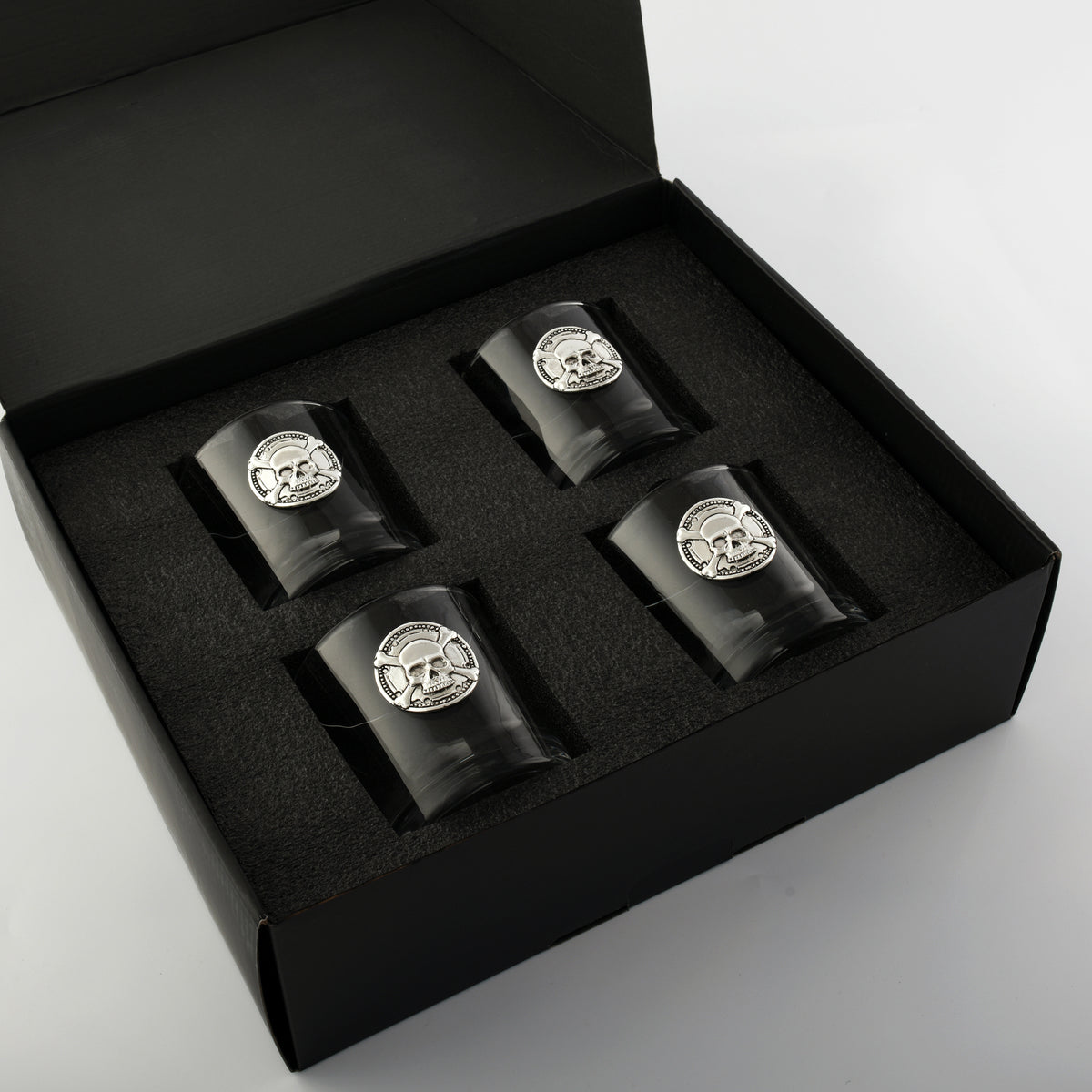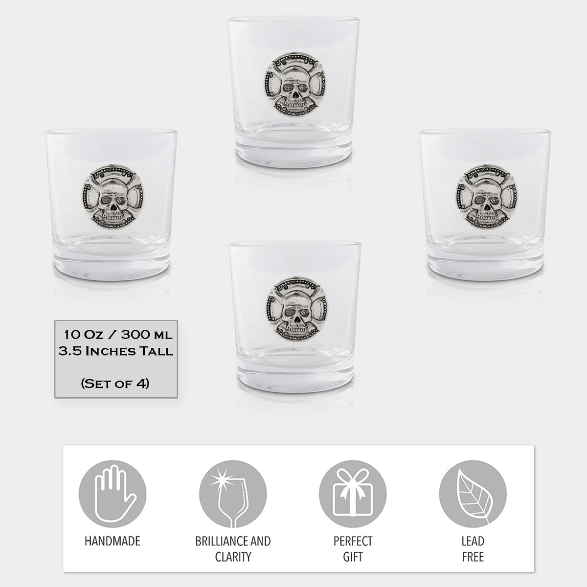 Each glass in this set of four features a high-quality metal skull, intricately crafted and securely attached to the front of the glass. This striking design not only adds a touch of bold character to your drinkware collection but also serves as an engaging conversation piece during social gatherings or intimate evenings at home.